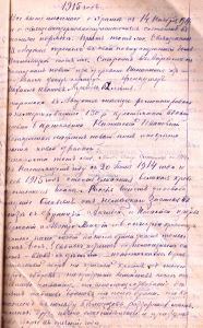 Записи за 1915 год совсем иные – идет Первая мировая война: «В настоящем году с 20 июля 1914 года и по сей 1915 год стоит ужасная великая кровопролитная война. <…> Сколько пало людей на поле брани, знает только один Бог! Сколько осталось беспомощных сирот – вдов с детьми – непостижимо. Идет постоянный сбор на Красный крест и много других сборов на призрение семейств отбывших на войну, на вспомоществование детям павших воинов на поле брани, на Комитет в пользу беженцев раззоренных мест и мног. друг. – почти еженедельные и праздничные сборы в течение года» (ГАКО, ф. 130, оп. 12, д. 220, л. 17.). Священник обращает внимание, что кругом не хватает рабочих рук, что урожай и сенокос пропадают под дождем, что посев озимых затянулся, а хлеб все дорожает и дорожает… «В народе появилась унылость. Недостаток хлеба, одежды, а главное обуви, производят в сельских обывателях тяжелое впечатление. <…> Религиозность в народе особенно заметно не упала, но посещающих храм Божий в праздничные дни много стало меньше….» (ГАКО, ф. 130, оп. 12, д. 220, л. 26 об.).